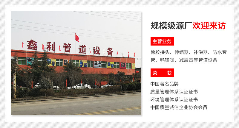 鑫利管道設(shè)備有限公司是生產(chǎn)各種橡膠接頭的生產(chǎn)廠家,。主要產(chǎn)品有橡膠管接頭、橡膠軟接頭、可曲撓橡膠接頭、單球體橡膠接頭、雙球體橡膠接頭、異徑橡膠接頭、卡箍橡膠接頭、絲扣橡膠接頭、90度橡膠接頭、異徑橡膠接頭、多球體橡膠接頭等。嚴(yán)格按照標(biāo)準(zhǔn)設(shè)計(jì)生產(chǎn),特殊規(guī)格型號(hào)可按用戶需要和要求訂做。設(shè)計(jì)獨(dú)特,結(jié)構(gòu)新穎合理,性能可靠,給工程施工、維修帶來極大的方便和效益。